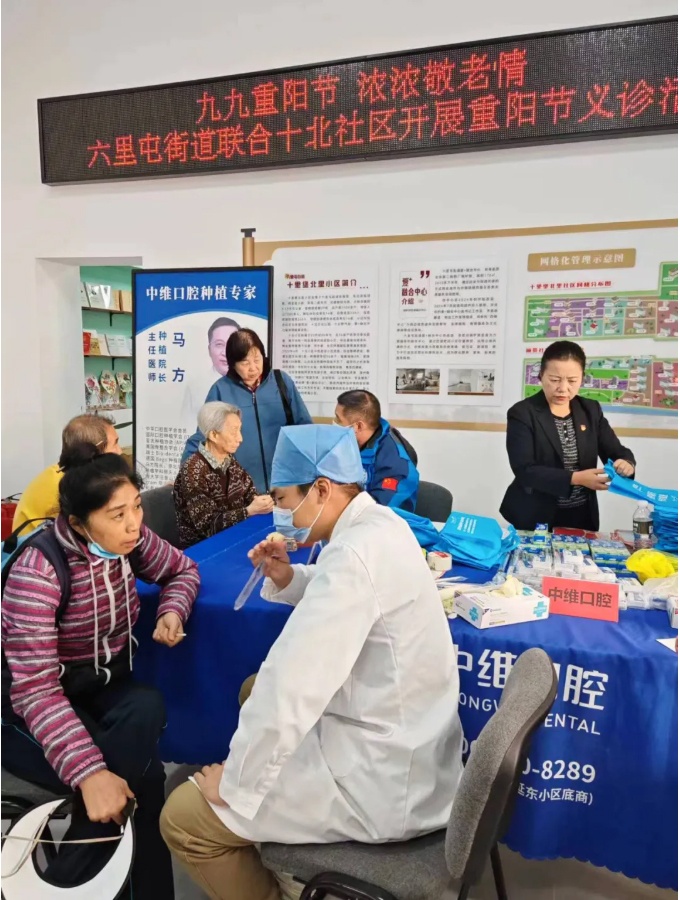 10月10日上午中维口腔党支部医护人员走进六里屯街道,在十里堡北里社区开展全民健康系列之“九九重阳节 浓浓敬老情”义诊活动。