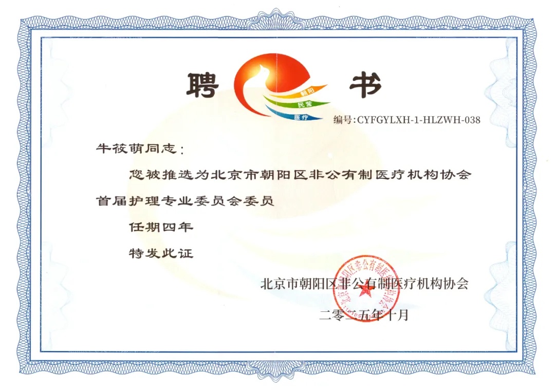 中维口腔医疗集团护理部主任牛筱萌同志当选为朝阳区非公有制医疗机构协会护理专业委员会委员