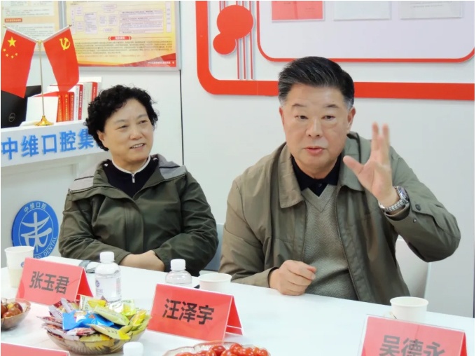 原九江市委常委、庐山区委书记汪泽宇对此次活动表示“很高兴”。他分享了自己的三点感受:第一,对中维口腔党支部给予了高度赞扬,看到医院标语齐全、工作人员佩戴党徽,感到十分欣慰。第二,得到一个好消息,他15年前做了5颗种植牙,听了马院长的讲解后,对种植牙能使用50年的寿命感觉放心了,很高兴。第三,在活动中碰到十几年、三十几年前认识的朋友,今天又结识了许多新朋友,很高兴。